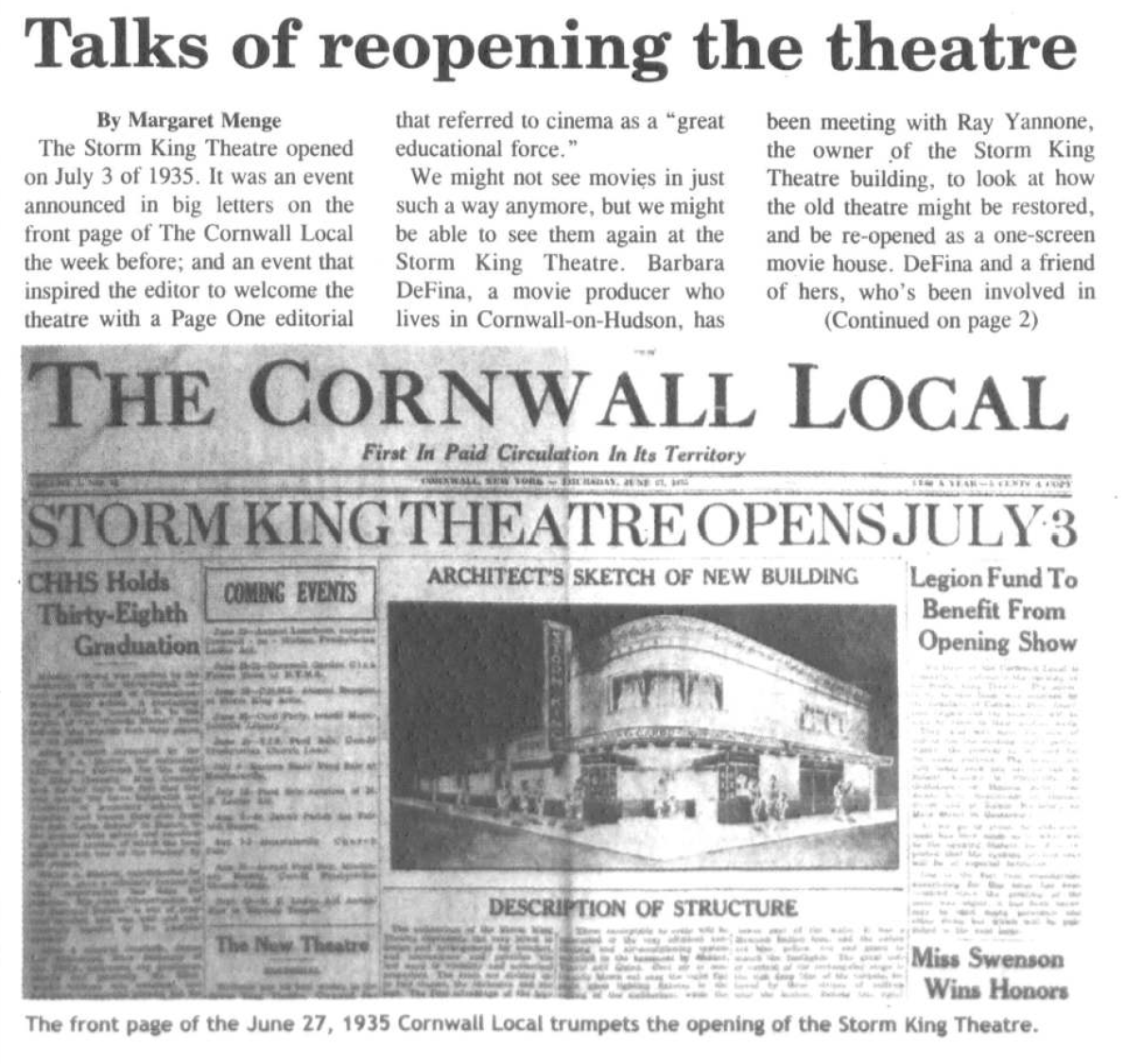 The Storm King Theatre opened on July 3 of 1935. It was an event announced in big letters on the front page of The Cornwall Local the week before; and an event that inspired the editor to welcome the theatre with a Page One editorial that referred to cinema as a “great educational force.”